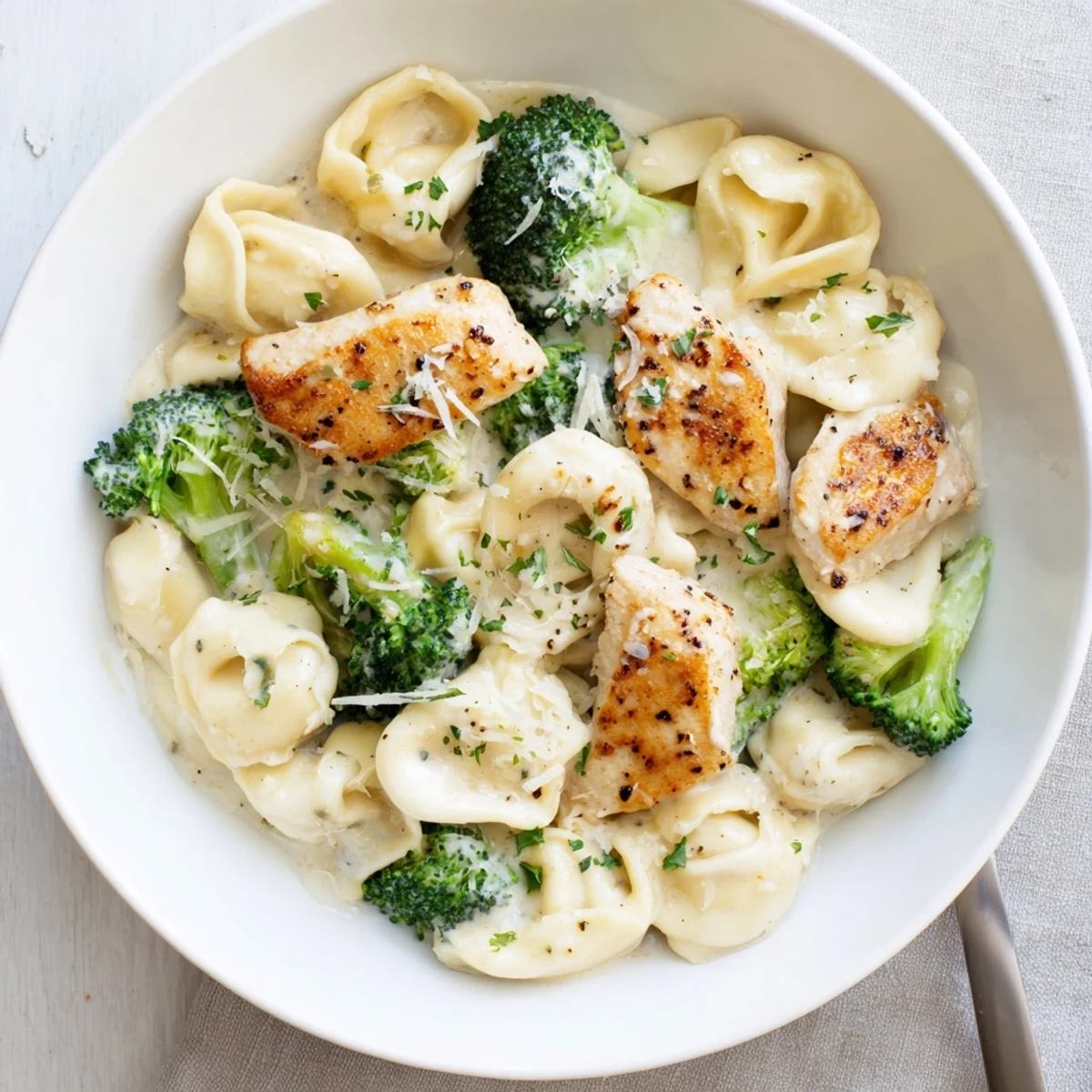 This one-pan pasta brings cheese-filled tortellini together with bite-sized chicken and bright broccoli in a silky garlic-parmesan cream. Cook tortellini and broccoli until tender, sear seasoned chicken until golden, then build the sauce with butter, cream and freshly grated Parmesan. Fold everything in, warm through and finish with extra cheese and chopped parsley for a hearty weeknight supper ready in about 40 minutes.